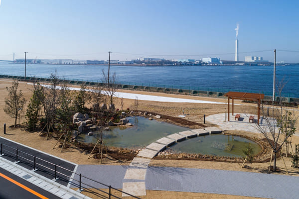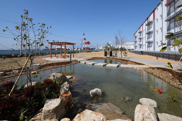 レッドウッド南港ディストリビューションセンター2は、敷地面7万平方メートルに対して緑地面積が1.2万平方メートル、緑地率は18%となっており、大阪市の基準(3%)を大きく上回る高い緑地率が特徴。建物西側は大阪湾に面し、ベンチや池を配置した広いビオトープエリアを設けていて、今回の認定では「周辺の生態系保全に寄与する可能性が高い」点も高く評価されたという。