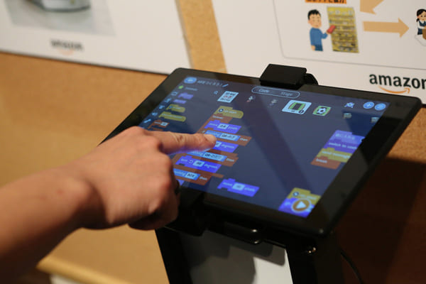 具体的には、アマゾンロボティクス(AR)の駆動部分「ドライブ」の原寸大模型や、PODと呼ばれる商品棚の「原寸大タペストリー(壁掛け)」、子供たちによるアマゾンロボティクスへの理解を助けるための「学習用プログラミング教材」、「川崎FCの仕組みをイラストにしたパネル」などを寄贈した。
