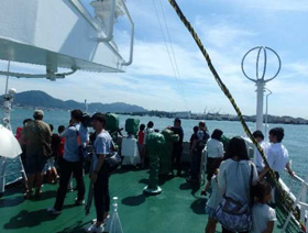 体験航海は8月8日、同協会と下関市港湾局、大島商船高等専門学校・九州海事広報協会が共催したもので、同日午前の部に市内の小学校教員ら22人、午後の部には一般公募で当選した小中学生親子42人が参加した。