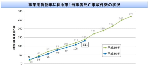 調査・データ全日本トラック協会(全ト協)は17日、事業用大型・中型・普通トラックが第一当事者となる交通死亡事故件数をまとめ、公表した。これによると、1月から7月末までの累計死亡事故件数は131件で、前年同期に比べて8件減少したことがわかった。