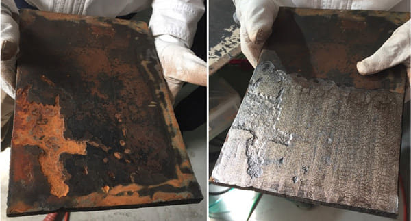 ▲CoolLaserによるレーザークリーニング効果(写真左:クリーニング前、右:クリーニング後)
