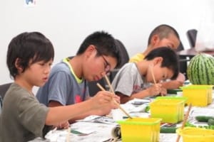 絵手紙教室では製作前に講師の中溝裕子さんから、自分が食事をするまでにさまざまな人が関わっていること、元気でいるために食事が大切なことなどの話があり、参加した子供たちは真剣な様子で耳を傾けていた。その後、地域住民からもらった野菜を題材に、両親や祖父母に宛てて日々の感謝の気持ちなど一言添えた絵手紙を作った。