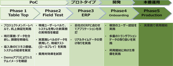 具体的には、顧客へのヒアリングや少人数のワークショップを開催し、SCMの自社ビジネスへの活用方法の検討を進める企業を支援するほか、受発注・入出荷などの既存業務の課題解決や効率化に向けた業務コンサルテーションを実施し、NTTデータのブロックチェーンソリューションを活用したデモアプリケーションを構築し、実現性や効果を確認・検証しながら段階的にプロトタイプ開発から本番適用へと進める。