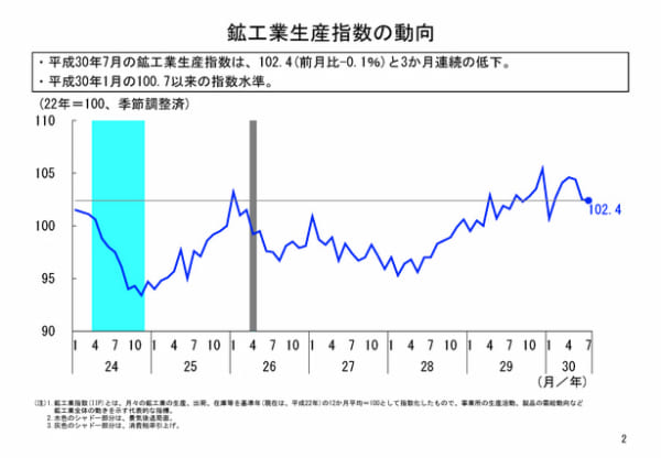 調査・データ経済産業省が8月31日発表した7月の鉱工業指数(速報)によると、生産は季節調整済指数102.4で前月比0.1%低下と3か月連続の低下となった。ことし1月以来の低水準。基調判断は、「生産は緩やかに持ち直しているものの、一部に弱さがみられる」に下方修正した。