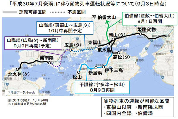 現在の運転中止区間は東福山駅・新南陽駅(山口県)間の221.5キロのみとなっており、このうち広島貨物ターミナル駅・新南陽駅間の115.9キロが9日にも再開できる見通しで、残る東福山駅・広島貨物ターミナル駅間の105.6キロは10月中の再開予定。