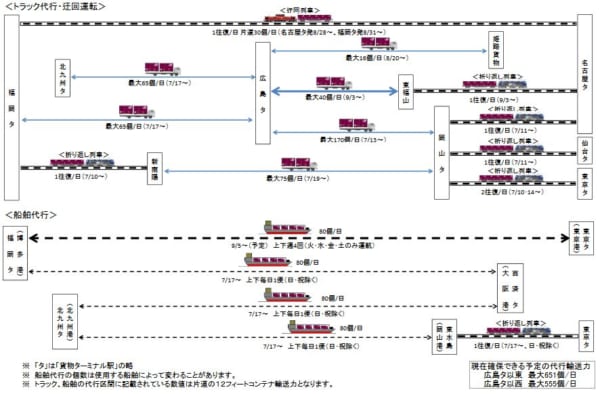 ロジスティクス日本貨物鉄道(JR貨物)は3日、7月の西日本豪雨に伴う不通区間で実施している代行輸送区間を増強し、新たに2つの区間でトラックと船舶による運転を行うと発表した。