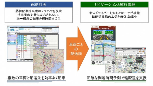 複数の車両を組み合わせて効率よく配送できるように立案した計画が、手間なくナビタイムのナビゲーション機能や運行管理機能と連動することで、計画立案効率を高めるとともに、ドライバーへの正確な配車指示が可能になる。