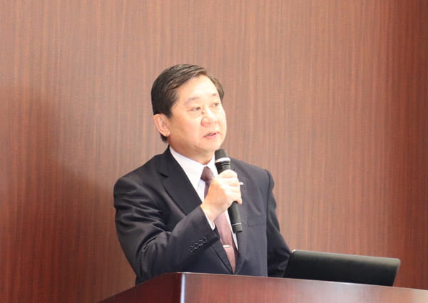 ▲ナビタイムジャパンとの提携を発表するパスコの島村秀樹社長