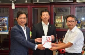 ▲贈呈式の様子(左から)肥後銀行の池田誠大津ブロック統括支店長兼大津支店長、城東運輸倉庫の下川公一郎社長、大津北中学校の鹿瀬島優校長