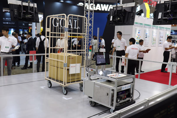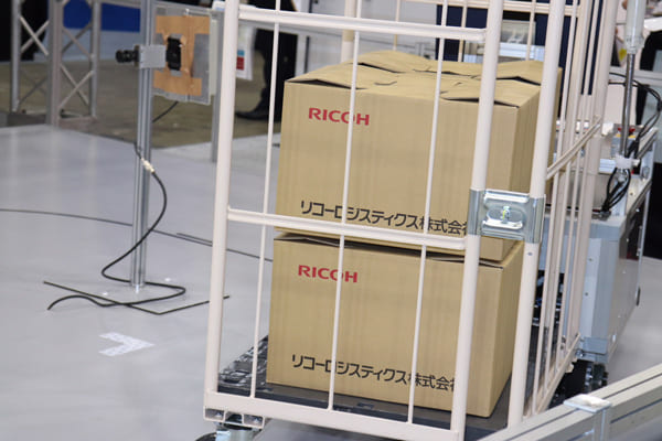 例えばリコーとリコーロジスティクスの展示ブースでは、2年前から販売を開始したというAGVの実演を見ることができる。同社製品の特徴は、ルート設定に用いるテープが磁気テープではなく、市販されている2センチ幅のテープであればいいという点だ。これによってルート設定の自由度は飛躍的に向上するとみられ、実際にリコーでは2工場で複数台を運用している。