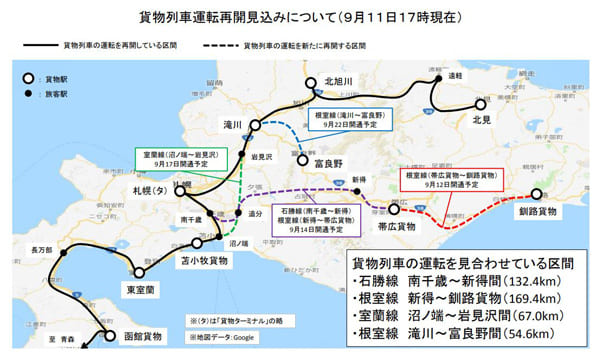 ロジスティクス日本貨物鉄道(JR貨物)は11日、北海道胆振東部地震により不通となっていた区間について、すべての区間で運転再開の見込みがたったと発表した。
