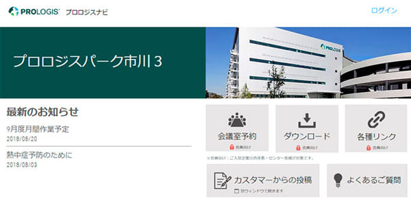 プロロジスでは、施設における入居カスタマーとのコミュニケーションを深め、より利便性の高いサービスの提供を目的として同サービスを開設。サイトでは施設情報閲覧、オンライン会議室予約、申請書などのダウンロードサービスを提供しており、スマートフォンやタブレットからもアクセスできる。