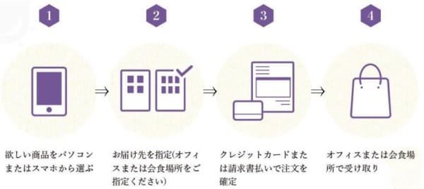 同エリア内で販売されているお菓子やお茶などの手土産をインターネットで注文し、オフィスへ配達してもらえるサービスで、取引先への訪問時に菓子折りなどの手土産を用意する際の「業務が忙しく購入する時間が無い」「購入して重い手土産を持ち帰るのが大変」といった悩みを解決する。
