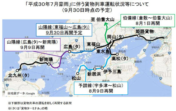 当初は「10月中」に再開される見通しだったが、JR西日本による「懸命な復旧作業」の結果、東福山駅・広島貨物ターミナル駅間の105.6キロが再開できることとなり、7月の西日本豪雨の影響による貨物列車の不通区間はすべて解消される。また、現在実施している列車のう回運転やトラック・船舶による代行輸送も終了する。