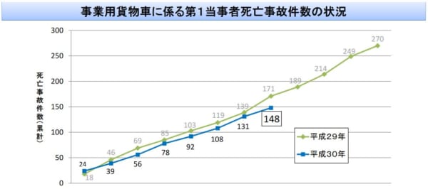 大型トラックが12件(4件減)、中型が5件(2件減)、準中型0件(9件減)、普通0件(前年並み)となった。なお、1月から8月までの累計死亡事故件数は148件で、前年同期に比べて23件減少している。