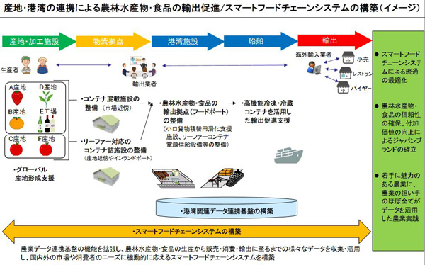 具体的には、コンテナ混載施設やリーファー対応のコンテナ詰施設の整備など物流拠点の整備、高機能冷凍・冷蔵コンテナを活用した輸出促進など、産地と連携して戦略的に輸出に取り組む港湾(フードポート)での農林水産物・食品の輸出促進基盤の整備、輸出に積極的に取り組む産地づくり、港湾関連データ連携基盤について農業データ連携基盤との連携も考慮しつつ構築、農業データ連携基盤を核としたスマートフードチェーンによる生産・流通改革などに取り組む。