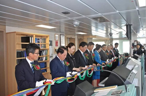 ▲SITCインターナショナルホールディングス楊紹鵬会長、会長夫人(右から5列目、6列目)、大鮮造船のJae Yong Ahn社長と社長夫人(左から3列目、4列目)、佐原光一市長(右から4列目)、藤原孝夫議長(右から3列目)、韓国船級社Jeong Ki Lee主席(右から2列目)