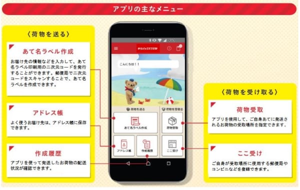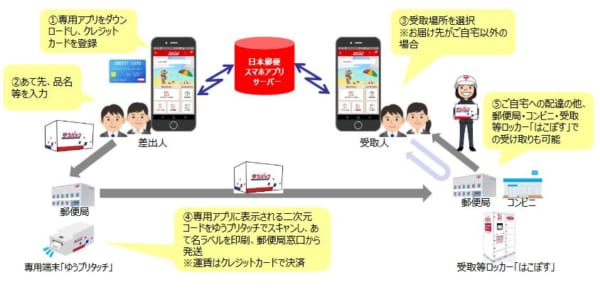 利用時は、アプリで表示される二次元コードを専用端末「ゆうプリタッチ」にスキャンすることで宛名ラベルを作成できる。すでにクレジットカードで決済が終了しているため、郵便局窓口で発送する際の支払いも不要となる。