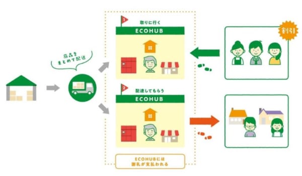 利用者(対象商品の購入者)は、専用のウェブサイトやスマートフォンアプリでエコハブへ荷物を「取りに行く」か「配達してもらう」かを選択。エコハブでの受け取りを選んだ場合、送料を5%割り引くほか特製のエコバッグを提供し、配達が選択された場合は佐川急便が宅配する。