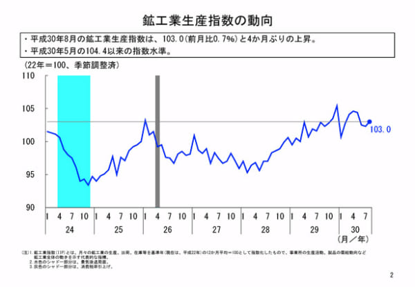 調査・データ経済産業省が9月28日発表した8月の鉱工業指数(速報)によると、生産は季節調整済指数103で前月比0.7%上昇と4か月ぶりの上昇となった。