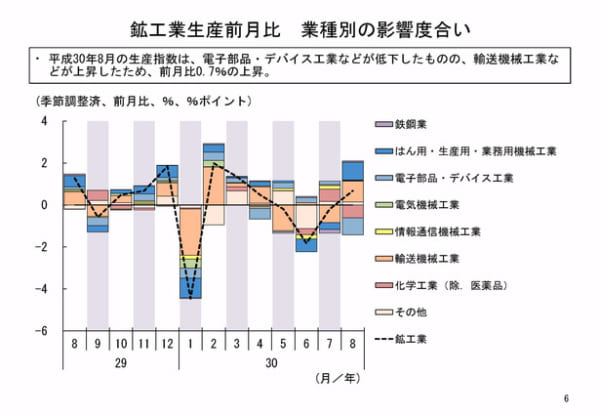鉱工業生産を業種別にみると、10業種が前月比上昇、5業種が前月比低下。輸送機械工業、はん用・生産用・業務用機械工業の2業種が生産上昇への寄与が大きかった。