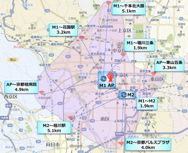 7月に連携・協力協定書を締結し、下京区を中心に実証実験のためのIoT向けデータ通信インフラを整備、ZETAのアクセスポイントを京都高度技術研究所棟の屋上に設置し、周囲2-5キロの範囲でZETA無線通信の接続を確認した。