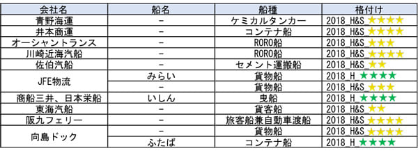 格付けでは、井本商運のコンテナ船がH&S(ハード対策&ソフト対策)で4つ星を獲得したほか、商船三井と日本栄船が申請した曳船「いしん」がハード対策で4つ星を得た。このほかの事業者は次の通り。