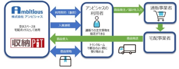 アンビシャスのトランクルーム「収納ピット」3店舗で、同社のトランクルーム契約者を対象に一部を「宅配品受取」専用とすることで、利用者の動向などを検証する。