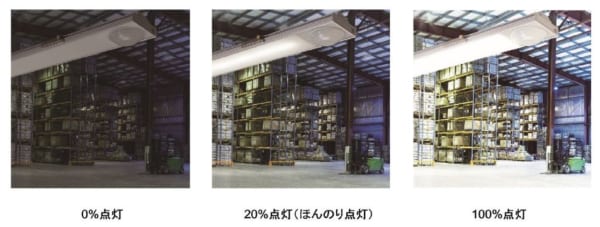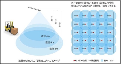 このセンサーは、人やフォークリフトの動きに反応して点灯・消灯・減灯するもので、これまで製品化されていた高天井用の人感センサー付きLED照明器具の形状では、物流施設でラックを積み上げると、センサーが反応しないか、ラックの影となる部分の照度を十分に確保することができないケースがあった。また、センサーと照明器具が一体ではなかったため、配線コストが膨らむ課題もあった。