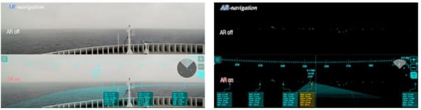 ▲(左)航海情報のAR表示(日中:ARオン/オフ比較)、(右)夜間:ARオン/オフ比較