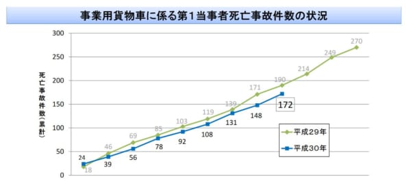 大型トラックが12件(3件増)、中型が8件(2件増)、準中型2件(1件減)、普通2件(2件増)となった。なお、1月から9月までの累計死亡事故件数は172件で、前年同期に比べて18件減少している。