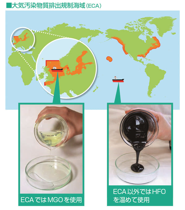 欧州、北米などの周辺海域には大気汚染防止を目的としたエミッション・コントロール・エリア(ECA)が設定されており、当該海域を航行する船舶に対しては硫黄分0.1%未満の燃料を使用することが義務付けられている。