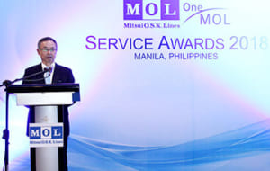 永年勤続表彰は、15年間にわたって同社船で勤務した船員を対象として表彰を行うもので、式典には受賞者とその家族60人が出席した。武藤光一会長からは、長きにわたり同社運航船の安全運航を担う船員自身と、その船員の乗船中、留守を支える家族双方の貢献に感謝を伝えると共に、ことし8月に開校した「MOLマグサイサイマリタイムアカデミー」の学生へ知識と経験を教える役割も期待しているとのメッセージを伝えた。