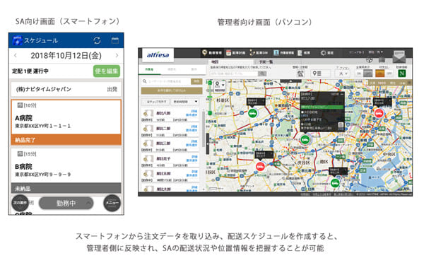 サービス・商品ナビタイムジャパン(東京都港区)は17日、アルフレッサ(東京都千代田区)の配送専門職であるセールスアシスタント(SA)向けの医薬品配送支援ツールとして「saios」(サイオス)を共同開発し、全てのSA用スマートフォン・管理者用パソコンに展開した、と発表した。