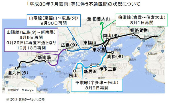 このほか、トラック代行輸送(3万6160個)、船舶代行輸送(2万842個)を実施し、う回・代行合計で不通区間輸送量の最大26.6%をカバーした。なお、山陽線不通による減送量は163万3200トン(暫定値)となった。