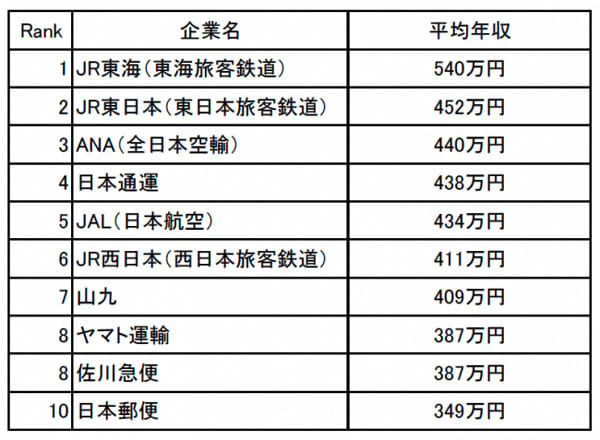 調査・データ企業口コミ・給与明細サイト「キャリコネ」を運営するグローバルウェイ(東京都港区)は18日、ユーザーが投稿した情報をもとにまとめた「運輸業界の年収ランキング」を発表した。1位は東海旅客鉄道(JR東海)で平均年収は540万円、ヤマト運輸、佐川急便、日本郵便の宅配3社は400万円を下回る結果となった。