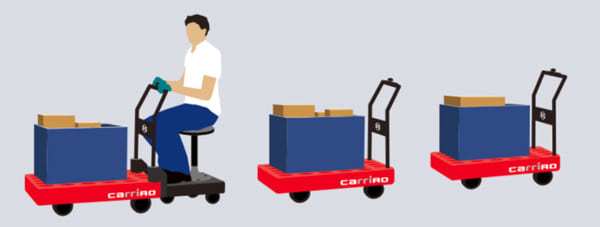 キャリロはハンドル部のジョイスティックを操作し、電動で操作することが可能なため、搭乗用のボードを連結することによって、操作者は歩行の必要なく長距離の搬送や移動が可能となる。