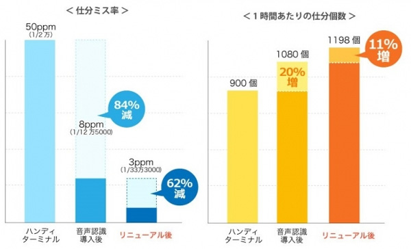 端末のスペックが上昇したことで反応速度が向上し、ディープラーニング技術による音声認識精度の向上と合わせ、作業効率がリニューアル前から20%アップ。ミス率は62%減少し、33万分の1となった。