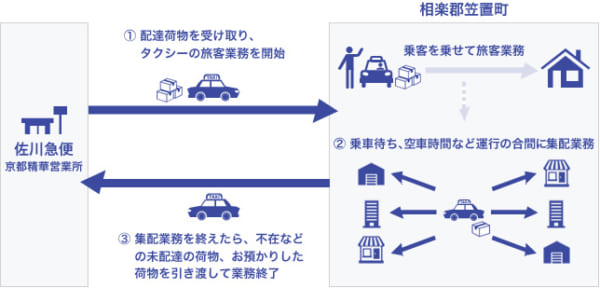 山城ヤサカ交通のタクシーの荷室に佐川急便の宅配荷物を積み込み、旅客事業を行う以外の時間帯に荷物を配達する。計画しているエリアは京都府笠置町で、乗客の利用が比較的少ない日中の時間帯を活用し、乗用タクシーの運転手が個別配送する。