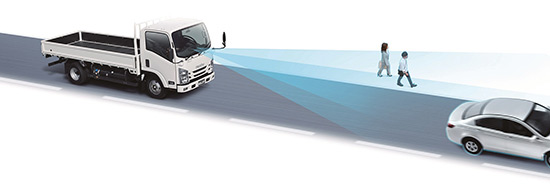 新たに標準装備となった先進安全装置として、小型トラックの事故分析結果に基づき、車両のみならず歩行者や自転車の検知に優れるステレオカメラを採用した。これにより、昼夜を問わず車両・歩行者・自転車といった障害物を立体的に検知し、万が一衝突の恐れがあると判断した場合には警報・制動装置を作動させ、衝突被害の軽減や衝突回避を支援する。