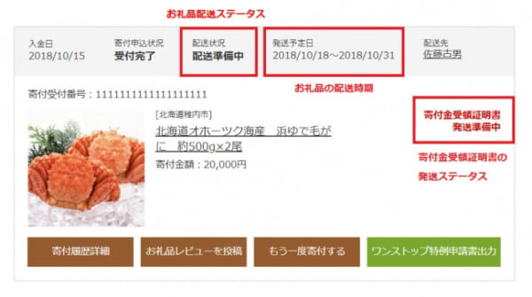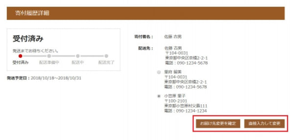 ふるさと納税の寄付後にマイページから配送先の変更が可能になったほか、寄付金受領証明書の詳細な発送ステータスが確認できるようになった。発送ステータスは「発送準備中」「発送予定」「発送完了」「不達」の4パターンあり、「発送予定」「発送完了」のステータスは日付まで表示される。