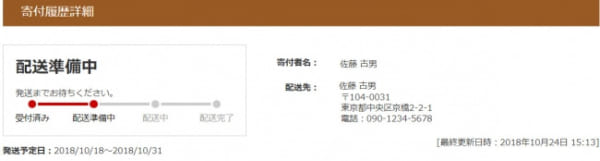 具体的には、マイページの寄付受付履歴一覧、寄付履歴詳細ページからお礼品の発送予定日を確認できるほか、「配送準備中」「配送中」など配送ステータスを確認することができる。また、発送時だけでなく交通・天候状況などの影響により発送が遅延した場合や、配送時に不在だった場合などにメールで通知する機能も加わった。