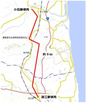 日本郵便は30日、小高郵便局(福島県南相馬市)-浪江郵便局(福島県浪江町)間9キロで、「目視外補助者なし飛行」によるドローンを用いた荷物輸送を、11月7日から開始すると発表した。
