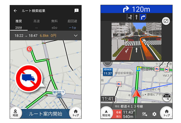 検索できるルートは「推奨」「高速優先」「無料優先」「幹線優先」の4種類となっており、複数の配送先を回る際に最適な配送順を提案する「巡回経路検索」機能も搭載。経由地は20か所まで設定することができる。さらに、トラックの駐車可能な施設の検索、休憩施設検索、交通規制情報アイコンの地図表示、地図の航空写真表示など、「トラックならでは」の機能も搭載している。