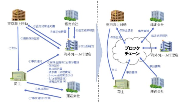 実験では、事故報告書や貨物の損傷写真、インボイス(商業送り状)などの実際の保険金の支払い業務で利用したデータをブロックチェーン上に流通させて、欧州、米州、アジアの計8拠点の海外クレーム代理店や鑑定会社へすばやく共有され、保険金の支払いプロセスに利用できるかを検証した。