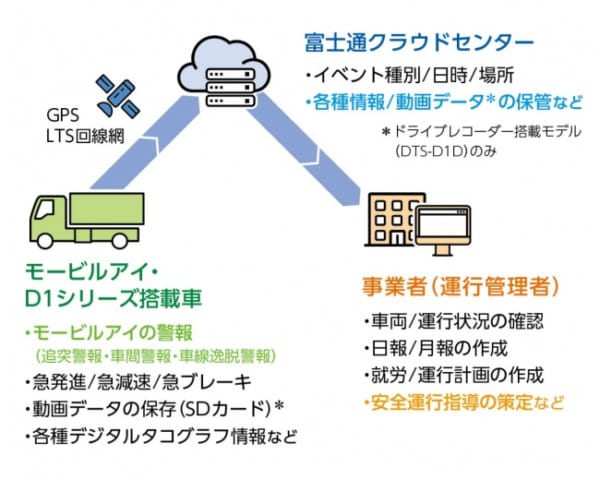既にD1シリーズ製品を導入済みの事業者は、モービルアイを採用することで、各ドライバーの危険運転を見える化し管理者にリアルタイムで通知、追加費用を支払うことなく高次元の安全性と運行管理を実現できるようになった。同様に、モービルアイを単独で運用している事業者は、D1シリーズ製品を導入することで、モービルアイ警報の見える化が実現できる。