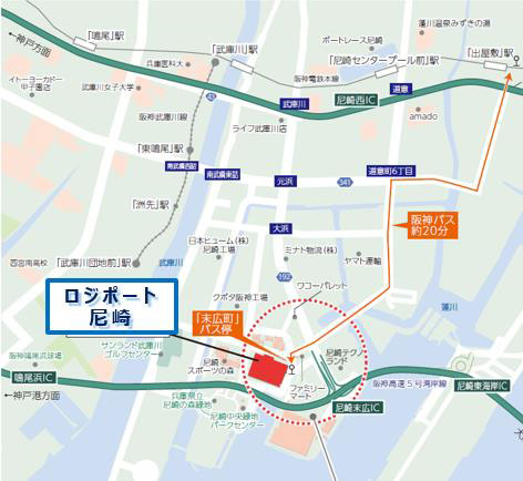 神戸エリア・難波・新大阪エリアへ30分、梅田エリアへ25分と、京阪神中心部へのすばやい配送が可能で、物流の効率化・最適化を実現する。また、阪神高速湾岸線尼崎末広インターチェンジ(IC)まで200メートルと近く、関西エリアを縦横に走る阪神高速を経由して名神高速・中国道・山陽道といった高速道路へのアクセスにも優れる。