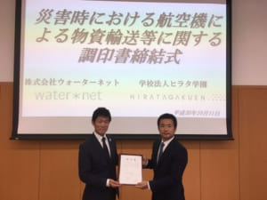 環境・CSR水宅配事業を展開するウォーターネット(東京都中央区)は7日、学校法人ヒラタ学園航空事業本部(神戸市中央区)と10月11日に災害時の航空機による物資輸送に関する協定を締結したと発表した。