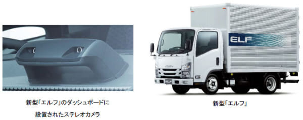 今回、いすゞから10月29日に発売された新型エルフでは、衝突被害軽減ブレーキや車間距離警報、車線逸脱警報、先行車発進通知機能、誤発進抑制機能といった安全機能が搭載されている。これらの安全機能を実現する最適なセンシング製品として、すでに乗用車への搭載実績を持つ同社のステレオカメラが採用された。