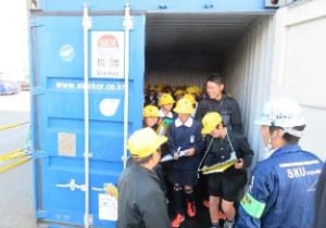 国際物流ターミナルでは、多目的コンテナ船がコンテナの荷役を行っている様子を見学するとともに、空のコンテナの中に入り、その大きさを体感。また、リーファー(冷凍・冷蔵)コンテナで運ばれてきたパプリカなどの食品がコンテナ内でどのように積まれているのかなども見学することができた。